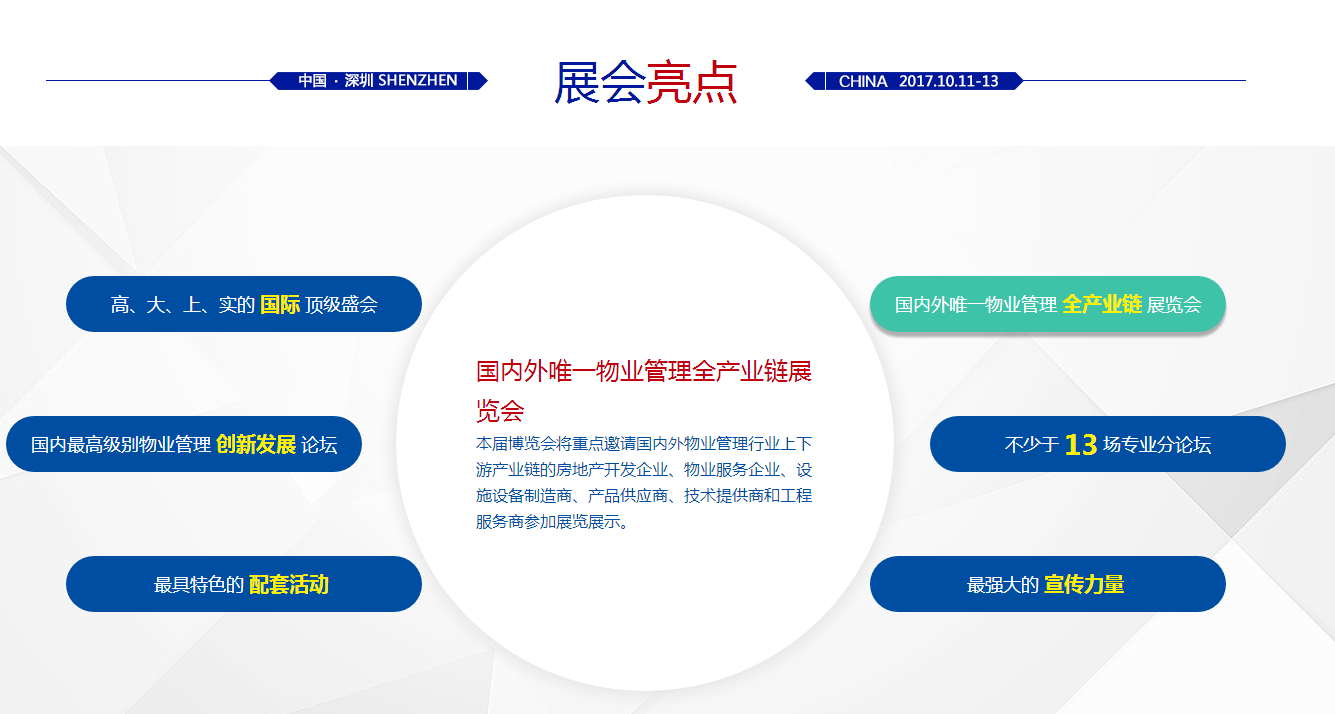 展览范围主要包括:科技物业、智慧社区、节能产品和技术、社区经济、培训教育等五类。展示的内容包括:企业经营管控系统,创新型体验类服务产品;家庭和商务智能机器人,安全安防设施和技术,环保节能产品和技术,智慧社区和科技物业系统,新一代停车技术和设备,社区O20运营模型,社区金融类产品,清洁卫生类技术和产品,线上线下类教育培训产品,以及配套资源类产品和服务等。